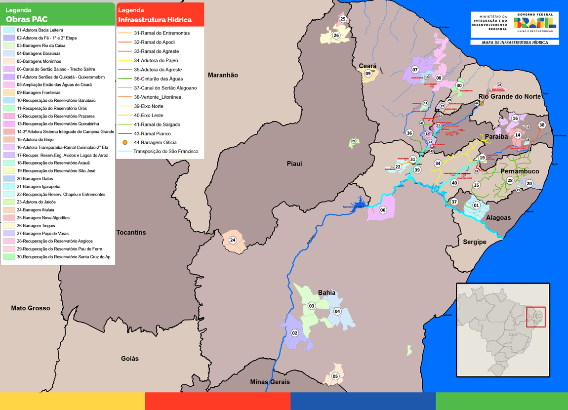 Além desses grandes canais da transposição do Rio São Francisco, outros projetos de segurança hídrica – como adutoras, ramais, reservatórios – estão espalhados pelos sertões da Bahia, Alagoas, Piauí e Maranhão, formando o que o Ministério da Integração e Desenvolvimento Regional (MIDR) chama de Caminho das Águas. Somando estudos e projetos em andamento, são mais de 70 ações, todas elas inscritas no Novo PAC.