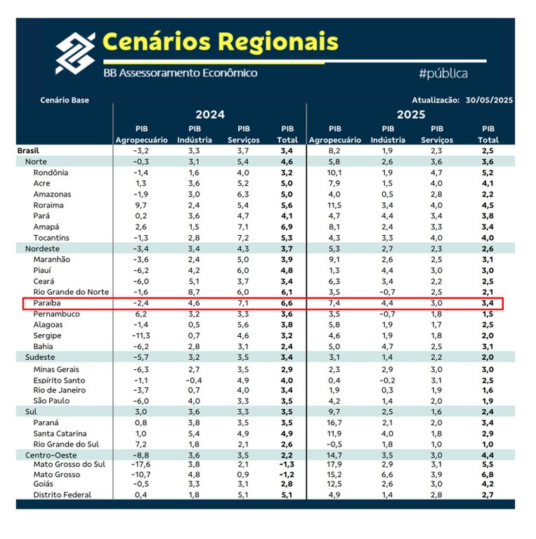 A economia da Paraíba vem registrando um desempenho expressivo em 2025, com destaque para a força do setor industrial. Segundo a Resenha Regional de Assessoramento Econômico do Banco do Brasil, divulgada em 30 de maio, o estado alcançou a segunda maior expansão industrial do Nordeste (4,4%) ficando atrás da Bahia (4,7) e a terceira do Brasil, além de apresentar um crescimento estimado do Produto Interno Bruto (PIB) de 3,4% — acima das médias nacional (1,9%) e regional (2,7%).