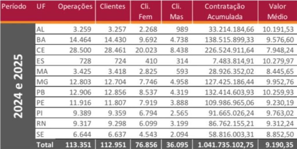 Maranhão– o programa alcançou 3,425 operações, com 3.418 clientes atendidos e R$ 28,9 milhões em crédito concedido. O valor médio por contrato é de R$ 8.445,65