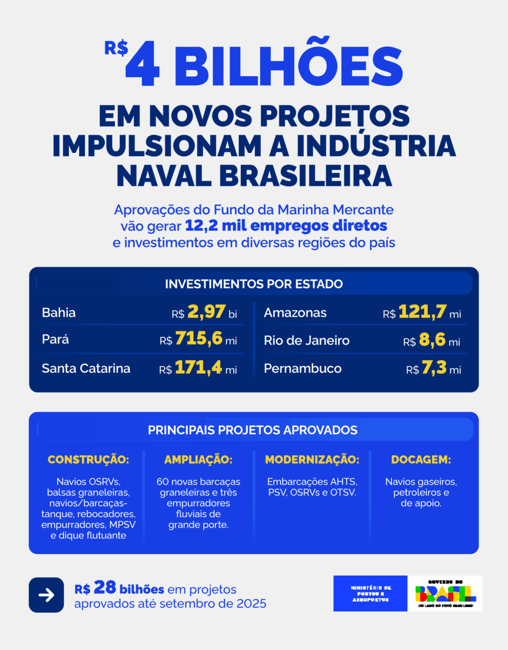 O Ministério de Portos e Aeroportos (MPor), por meio do Conselho Diretor do Fundo da Marinha Mercante (CDFMM), aprovou 14 novos projetos, no valor de R$ 4 bilhões, durante a 60ª Reunião Ordinária realizada na semana passada. As iniciativas incluem construção, modernização, docagem, manutenção e reparo de embarcações, além da construção de um dique flutuante, elevando para R$ 28 bilhões o total de projetos já aprovados neste ano de 2025.