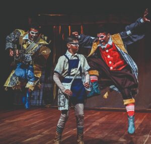 O espetáculo mescla a linguagem da música com o teatro, animação com teatro de bonecos, o circo e tem como foco o público infanto-juvenil. No espetáculo os atores fazem parte de uma trupe de artistas que saem pelas ruas, praças, teatros e circos contando histórias para as mais variadas plateias.